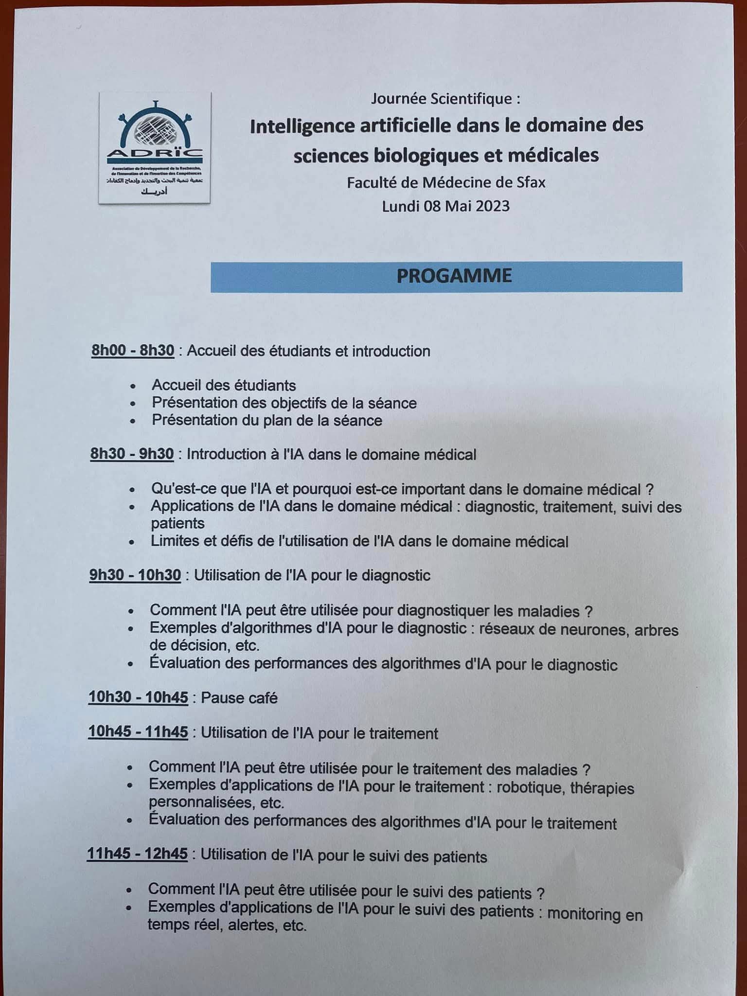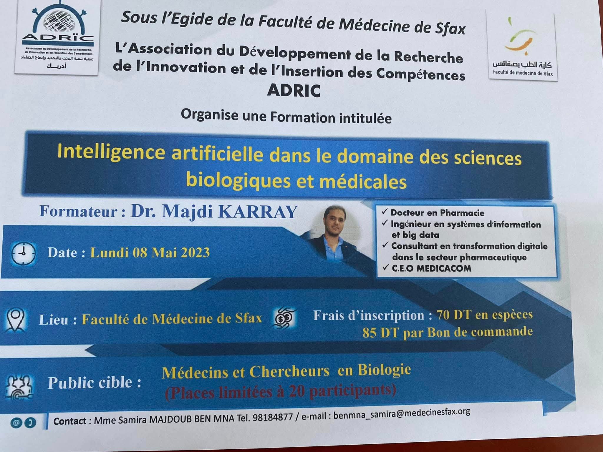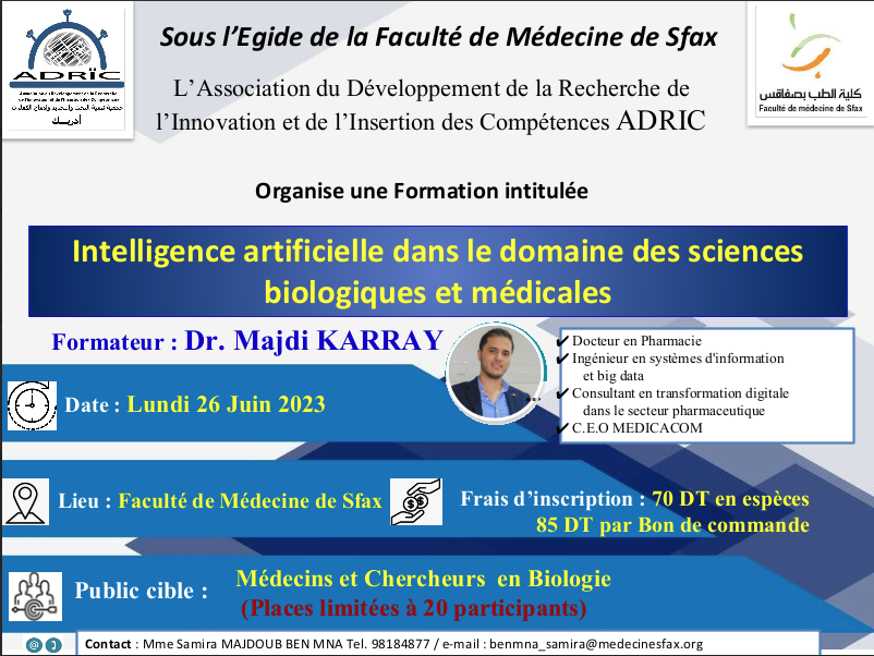The ADRIC Association organized, on Monday, May 8, 2023, at the Faculty of Medicine of Sfax, a training session entitled “Artificial Intelligence in the Field of Biological and Medical Sciences.”