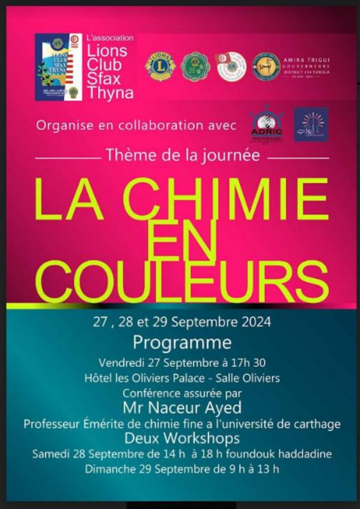 As part of its commitment to scientific outreach and the promotion of research and innovation, ADRIC (Association for the Development of Research, Innovation, and Skills Integration) actively participated in the event entitled “Chemistry in Colors”, held on September 27–29, 2024, in Sfax. This event, organized in collaboration with several academic and associative institutions, including the Lions Club, highlighted the importance of chemistry in everyday life through visually engaging and educational experiments. The opening conference, held at Hôtel Les Oliviers Palace on September 27, was delivered by Professor Naceur Ayed from the University of Carthage, a specialist in fine chemistry, and moderated by Professor Hammadi Ayadi and Mrs. Ben Salah, president of the TYNA Lions Club. ADRIC contributed to the success of this event by providing logistical and organizational support, thereby strengthening its role as a key player in the dissemination of scientific knowledge to the general public.