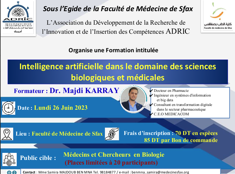 Intelligence artificielle dans le domaine des sciences biologiques et Médicales Dates: 8 Mai et 26 Juin 2023 Lieu: Faculté de Médecine de Sfax description: L’association ADRIC a organisé, le lundi 8 mai 2023, à la Faculté de Médecine de Sfax, une formation intitulée « Intelligence artificielle dans le domaine des…